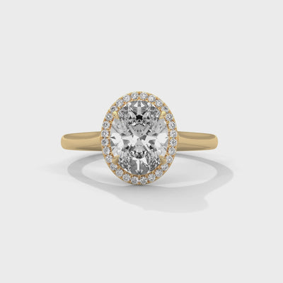 This refined 14-karat gold engagement ring presents a 2.14 carat total diamond weight with a graceful oval lab diamond as its focal point, encircled by a halo. Select from yellow, rose, or white gold to express your individual aesthetic.