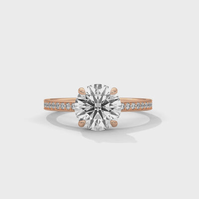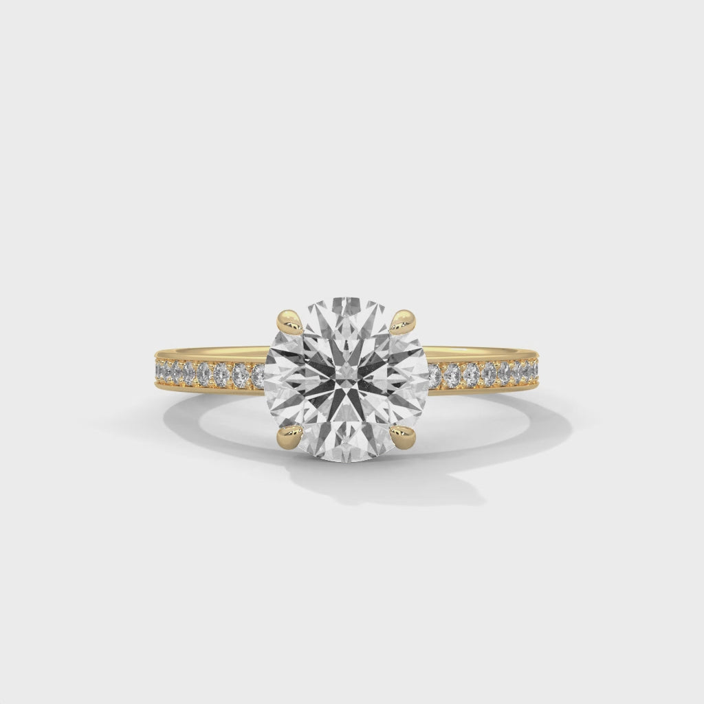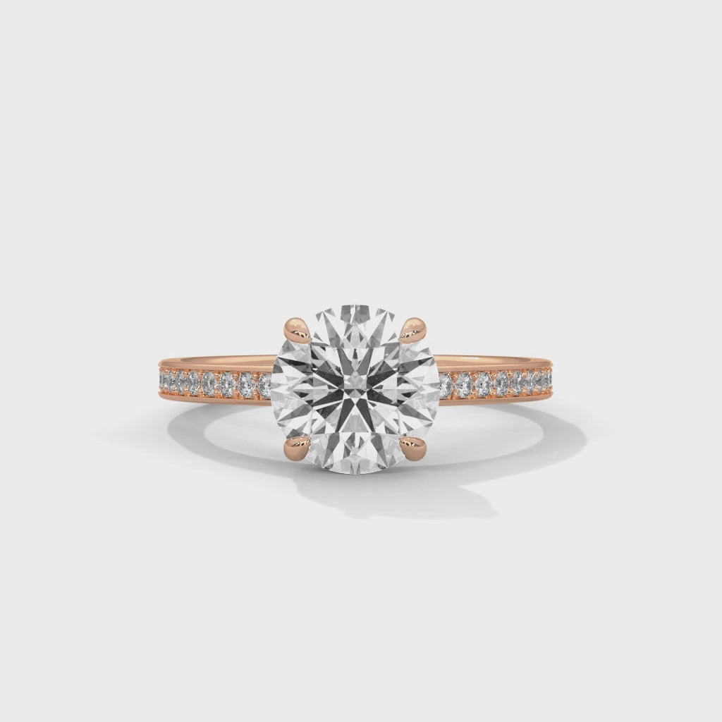 This 14KT engagement ring showcases a magnificent 2 carat round brilliant lab diamond in a secure four-prong setting designed to maximize sparkle and light performance. The band features intricate pavé detailing that adds refined sophistication without overwhelming the center stone. Crafted from premium 14-karat gold, this ring is available in yellow, rose, or white gold to suit your aesthetic preferences.
