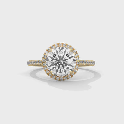 This stunning ring features a 2 CTW Round Brilliant Lab Grown Diamond in the center, surrounded by a Paved Halo setting. The paved band adds to the overall appeal. Available in yellow, rose and white gold options.