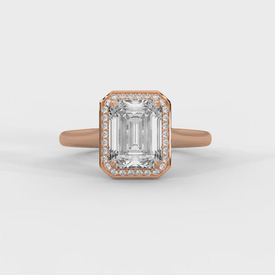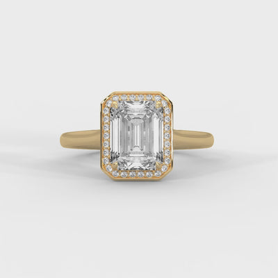 Make a statement of everlasting love with our 14KT 3.20 TDW Emerald Cut Solitaire Halo Lab Diamond Engagement Ring featuring a striking 3ct emerald-cut lab-grown center diamond surrounded by a luminous halo of accent stones. Expertly crafted in solid 14KT gold, this luxurious engagement ring combines modern refinement with timeless beauty.