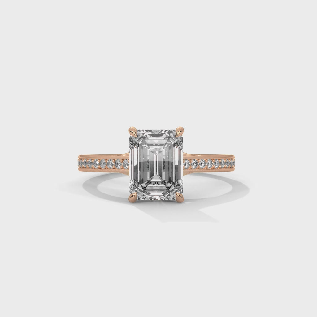 Center Diamond: A 3.00 CTW emerald cut lab-grown diamond with exceptional brilliance, serving as the focal point of the ring.